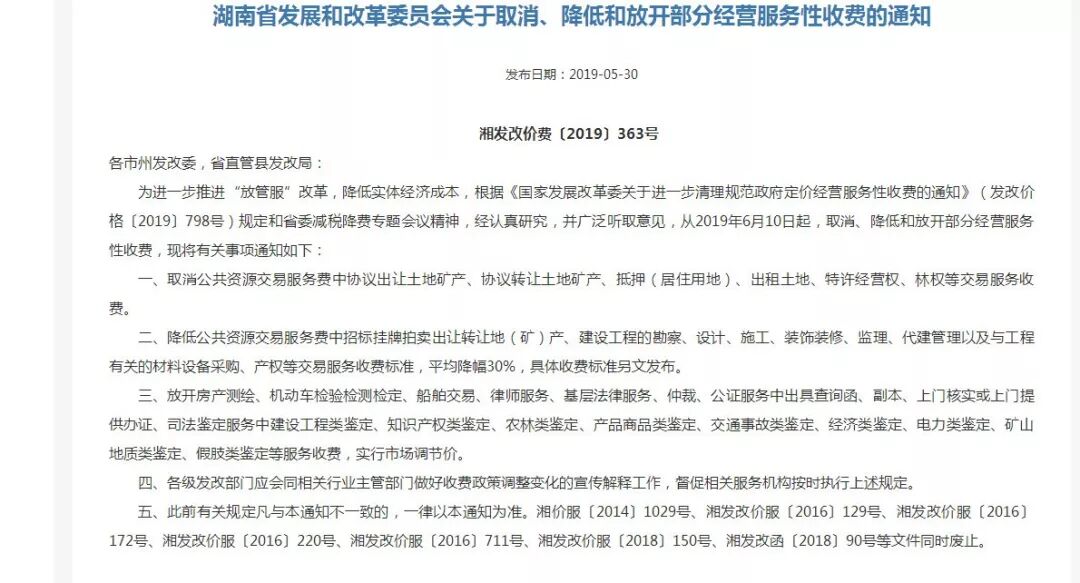 二、降低公共资源交易服务费中招标挂牌拍卖出让转让地(矿)产、建设工程的勘察、设计、施工、装饰装修、监理、代建管理以及与工程有关的材料设备采购、产权等交易服务收费标准,平均降幅30%,具体收费标准另文发布。