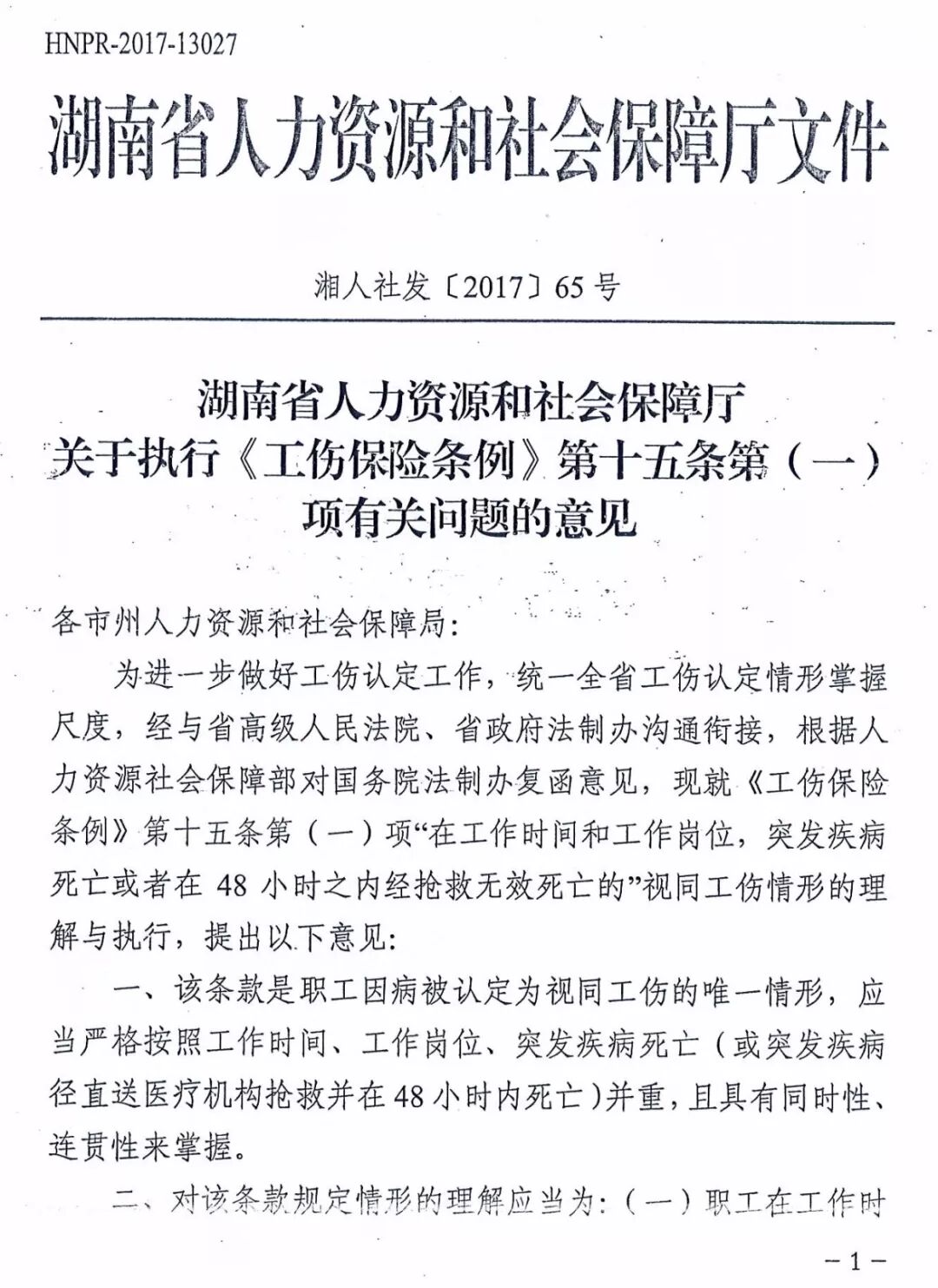 2017年9月5日,湖南省人社厅依据人社部对国务院法制办复函意见,下发了《湖南省人力资源和社会保障厅关于执行《工伤保险条例》第十五条第(一)项有关问题的意见》,劳动法库特此刊发,供大家参考!