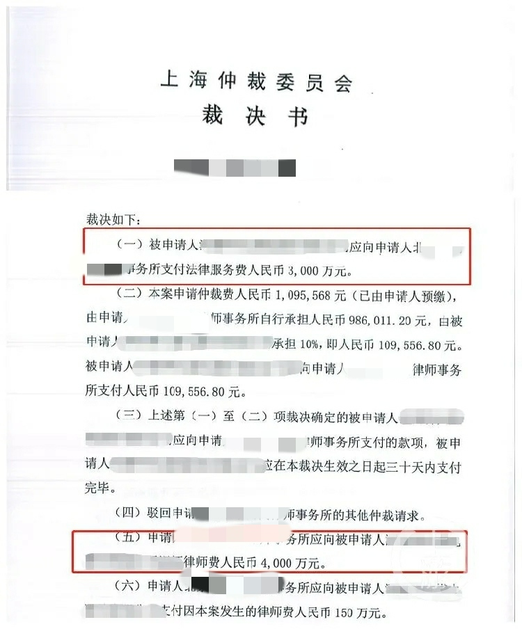 03为什么被拖欠律师费却还要面临赔偿?上海市德尚律师事务所主任王凡律师表示:“二者可能并不冲突。实际上律师并不是进行赔偿,而是退还一部分之前收取的律师费。”王凡律师表示,仲裁委可能认为,《一揽子和解协议》的形成与律所的代理无涉,律所主张风险律师服务费的条件未能实现,所以不适用聘请律师合同中关于风险律师服务费的相关条款,仲裁庭结合案件办理情况酌情支持了一部分的风险代理费用。由于律所之前收到的代理费高于仲裁委支持的金额,所以才被要求退还其中的4000万元。至于3000万元则可能是基本律师服务费,按照聘请律师合同应当由河南某公司支付。“由于仲裁裁决书一般不对外公开,我们很难了解到案件的全貌,这份裁决书是否会被撤就交给法院来进行判断了。”