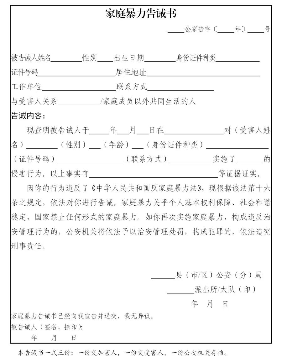 九、告诫书的内容,包括加害人和受害人的身份信息及双方关系、家庭暴力的事实陈述、认定证据、相关法律规定、禁止加害人实施家庭暴力以及再次实施家庭暴力的法律后果等。告诫书一式三份,一份交加害人,一份交受害人,一份公安机关存档。告诫书式样,由公安部统一制发。