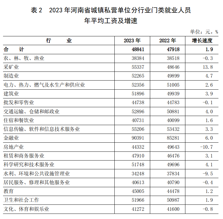 2023年河南省城镇私营单位就业人员年平均工资 48841 元