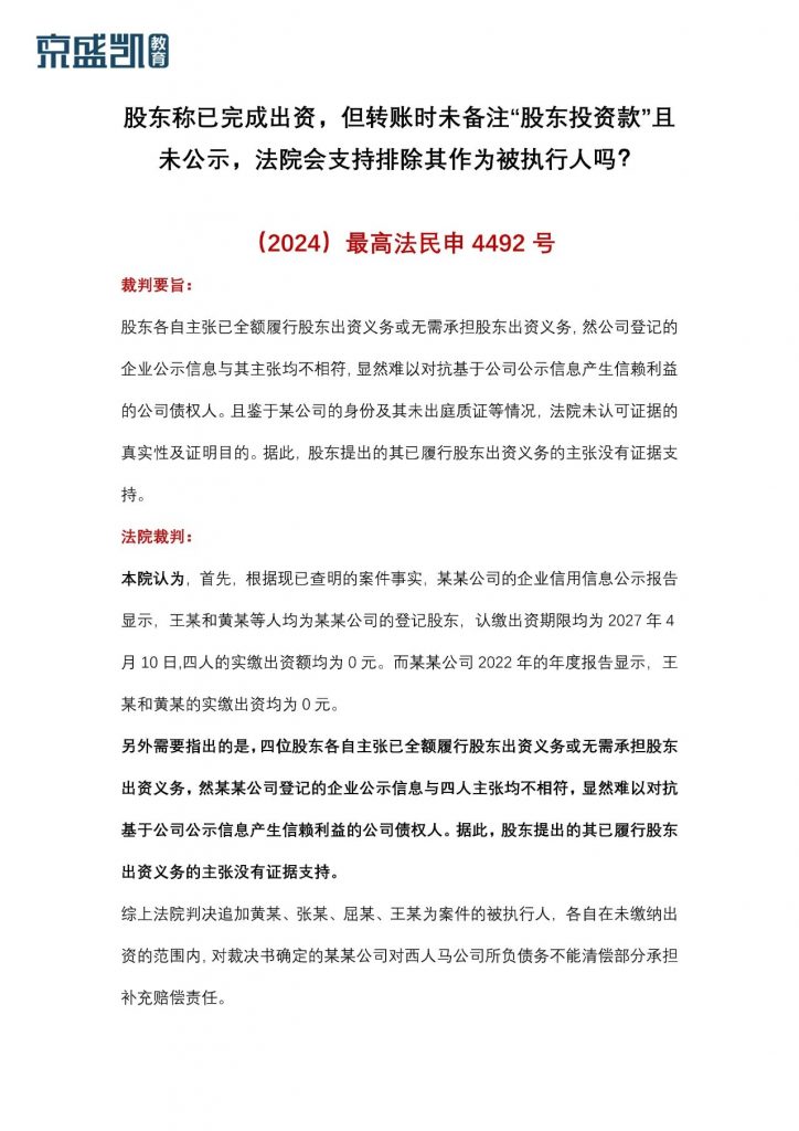 2024)最高法民申4492号丨股东称已完成出资,但转账时未备注“股东投资款”且未公示,法院会支持排除其作为被执行人吗? 发布: 2025年11月7日 1阅读 0评论 来源 京盛凯 特别声明:本文仅供交流学习,版权归属原作者所有,如标注来源错误或侵犯了您的权益告知,我们即时删除。